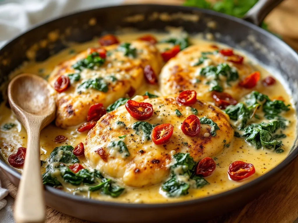 Picture this: tender, golden-seared chicken simmering in a velvety garlic-Parmesan cream sauce, loaded with fresh spinach and tangy sun-dried tomatoes.
