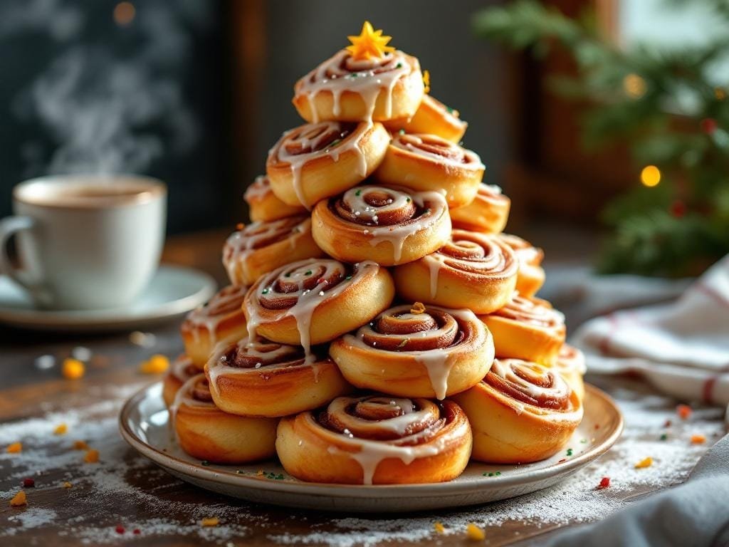 Drizzle glaze over warm tree. Add sprinkles, pinch of flaky salt, or a decorative sugar “star” at the top. Let rest 5–10 minutes before serving.
