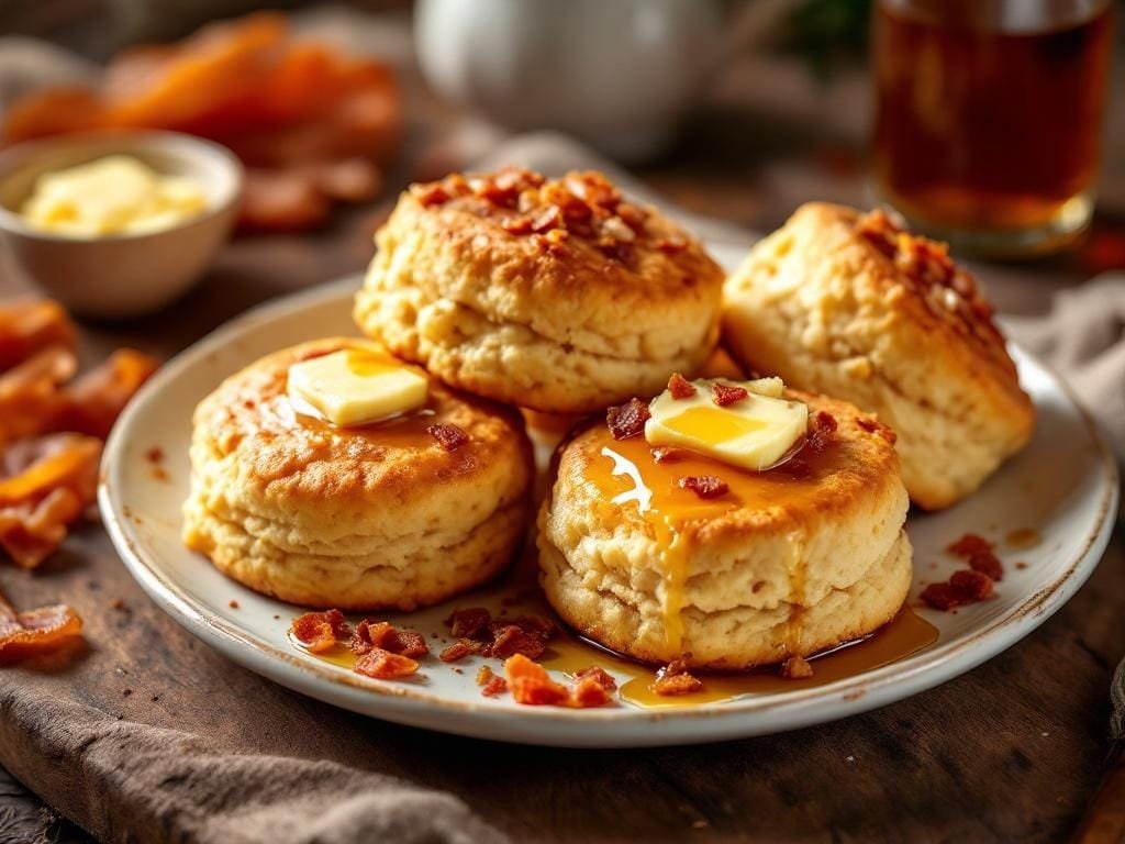 - Let biscuits cool for 3–5 minutes, then serve warm with honey butter, a sprinkle of leftover bacon, and—if you’re feeling extra sweet—a little drizzle of maple syrup on top.